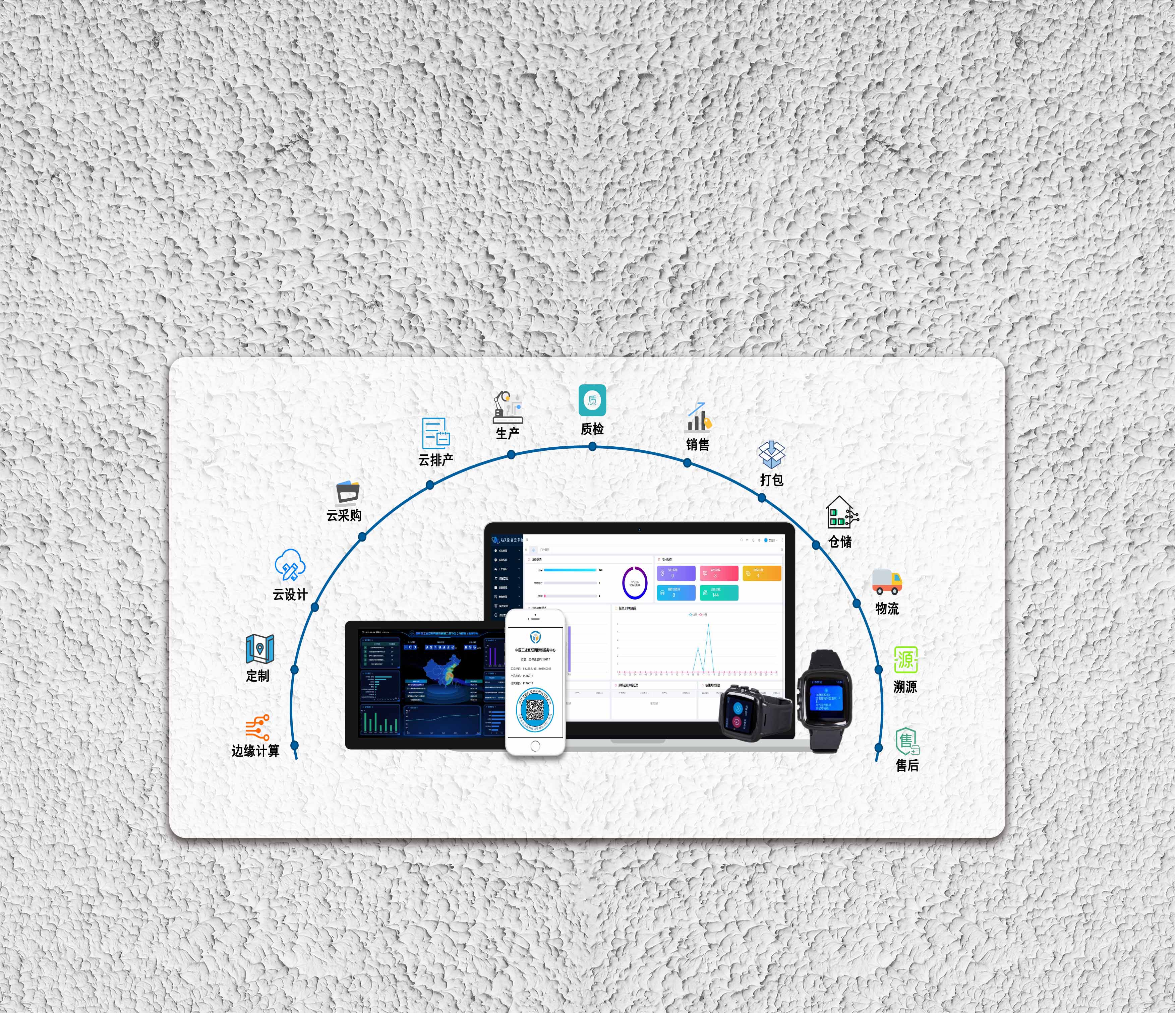 基于兴标壹Ava标识码云平台和兴标壹Ava设备云平台,以“一物一码,一码贯穿”为核心理念,贯通产业链上下游,为每个设备、原料、零部件、产线、产品、工艺、工序赋予唯一身份标识,标识关联企业各项数据信息,串联研发、生产、质检、供应链、物流各个环节,订单驱动,打通订单与生产的实时管理,产销状态互联互通,实现根据多种条件(订单号、盘卡、批次等)的生产工序过程状态追踪;建立全流程可视协同化生产管理,在此基础上,建立生产可视化驾驶舱、质检项目管理、质量管理知识图谱、延误报警、交付期预测等多个功能模块,突破行业质检瓶颈,提升企业质控及订单响应能力,实现供应链内及跨供应链间的企业产品设计、制造、管理和商务等合作的网络化协同生产模式。
